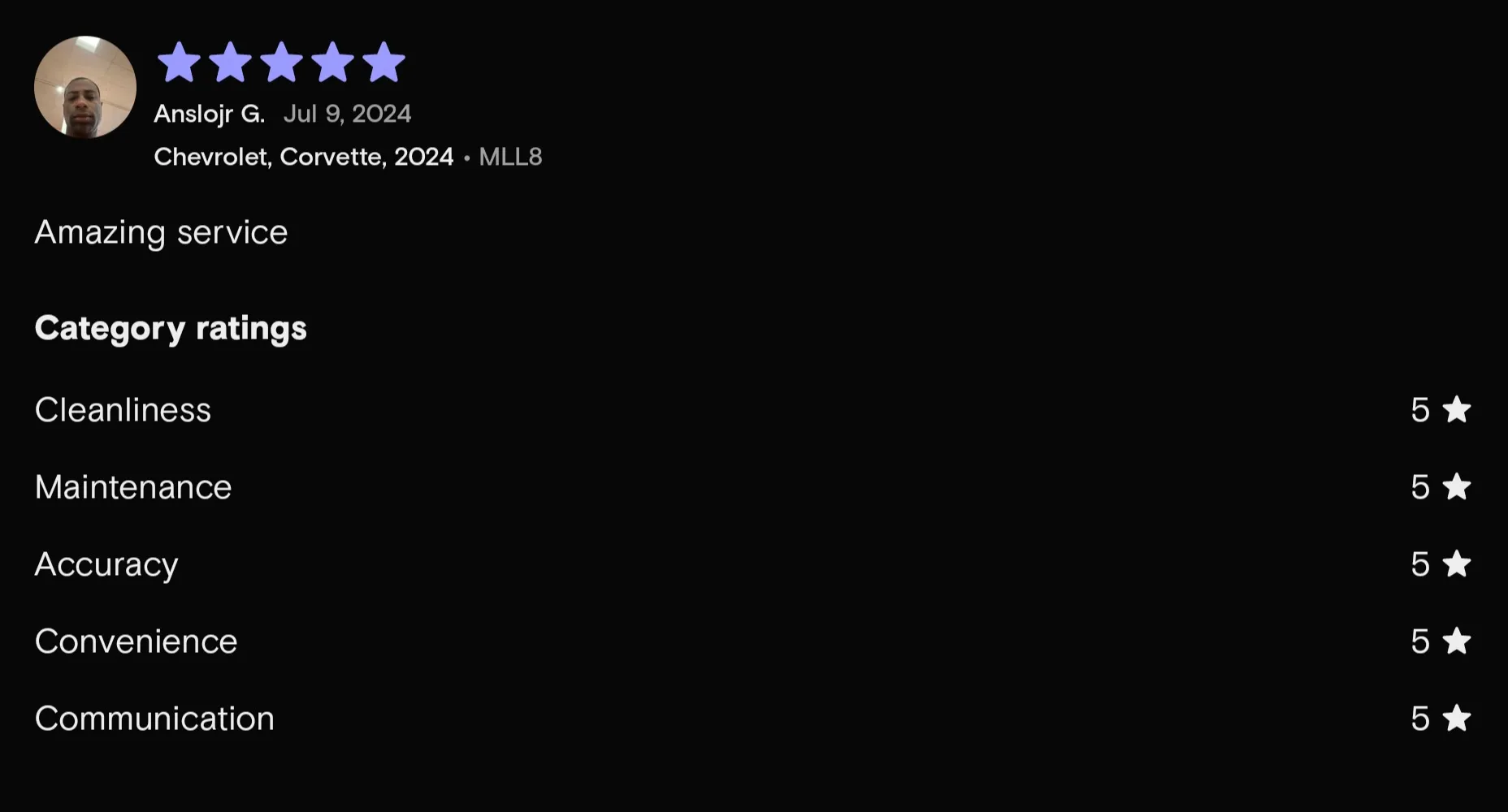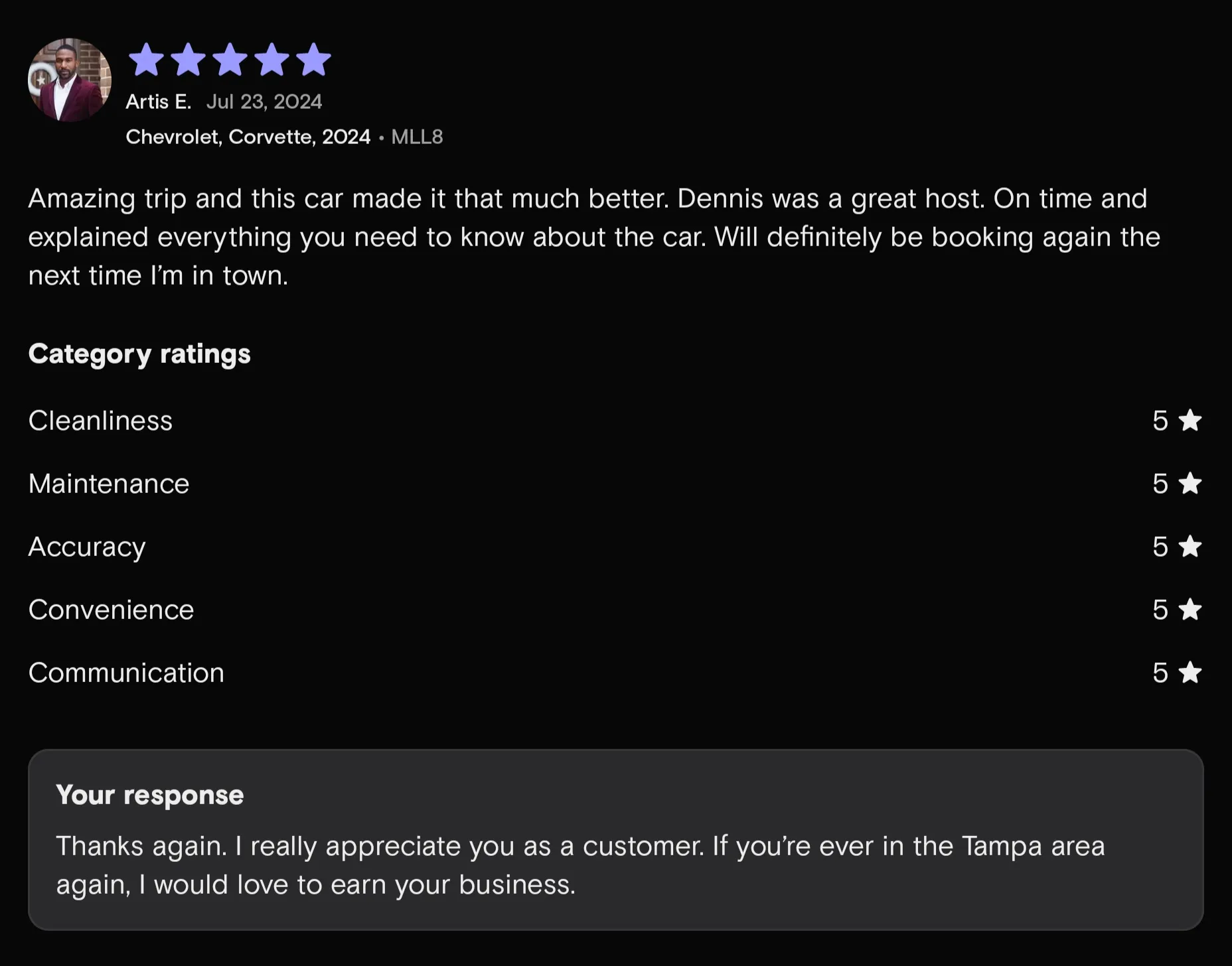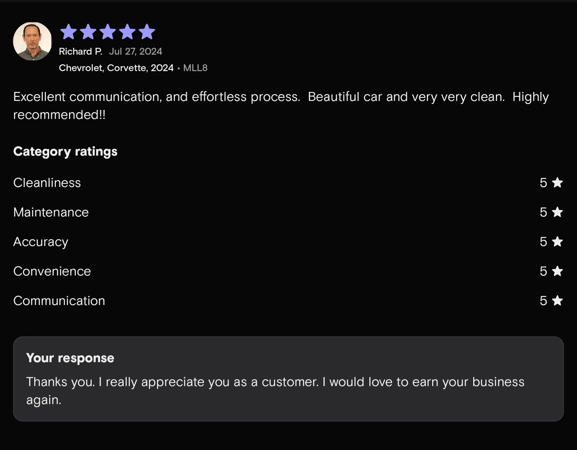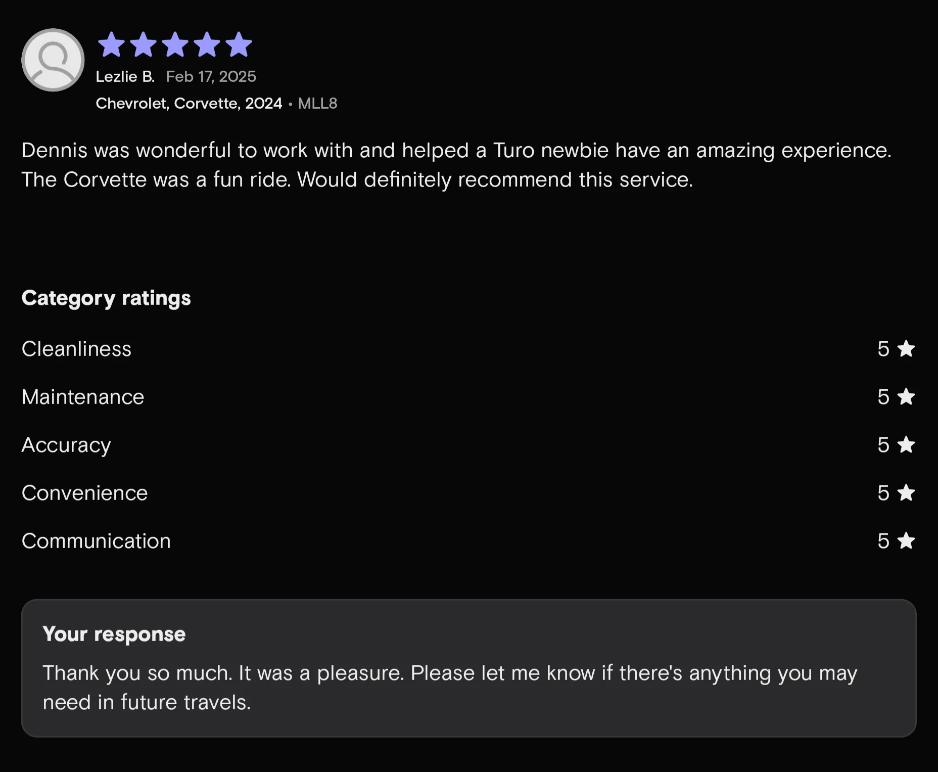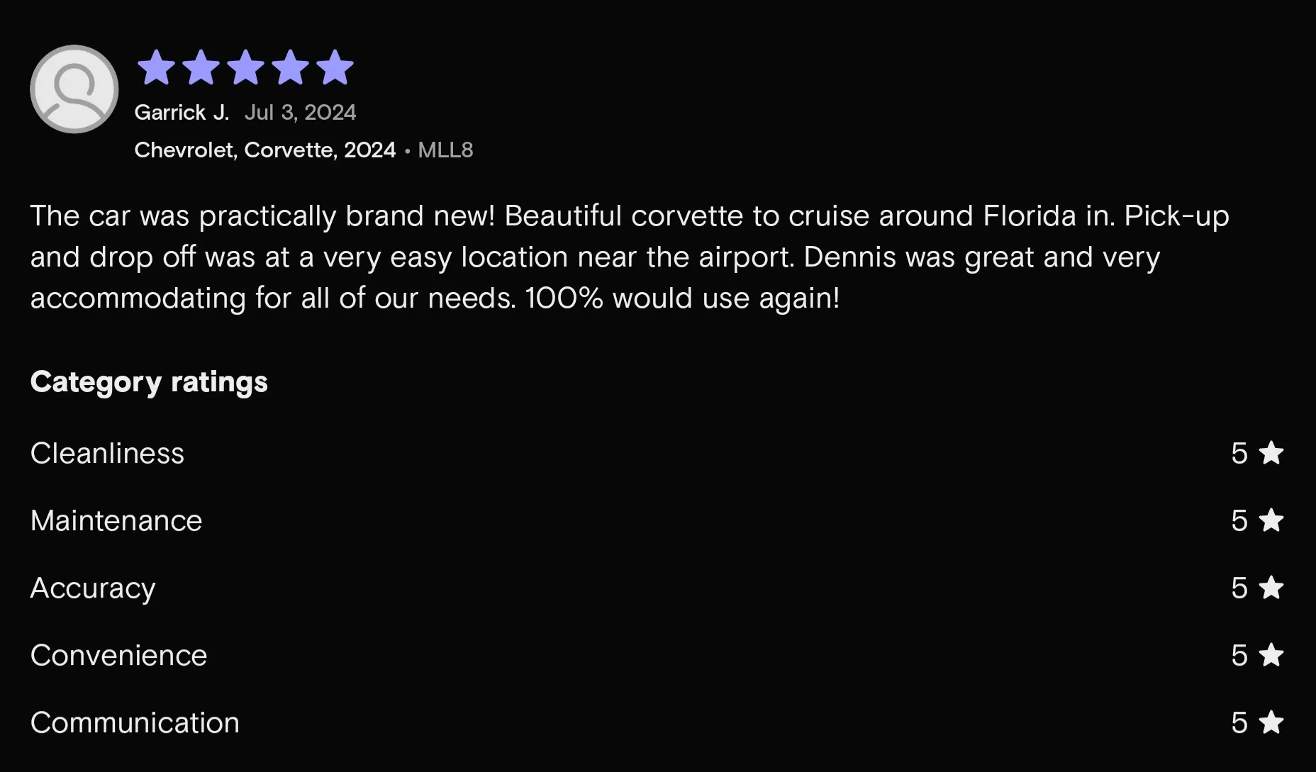 Garrick JThe car was practically brand new! Beautiful corvette to cruise around Florida in. Pick-up